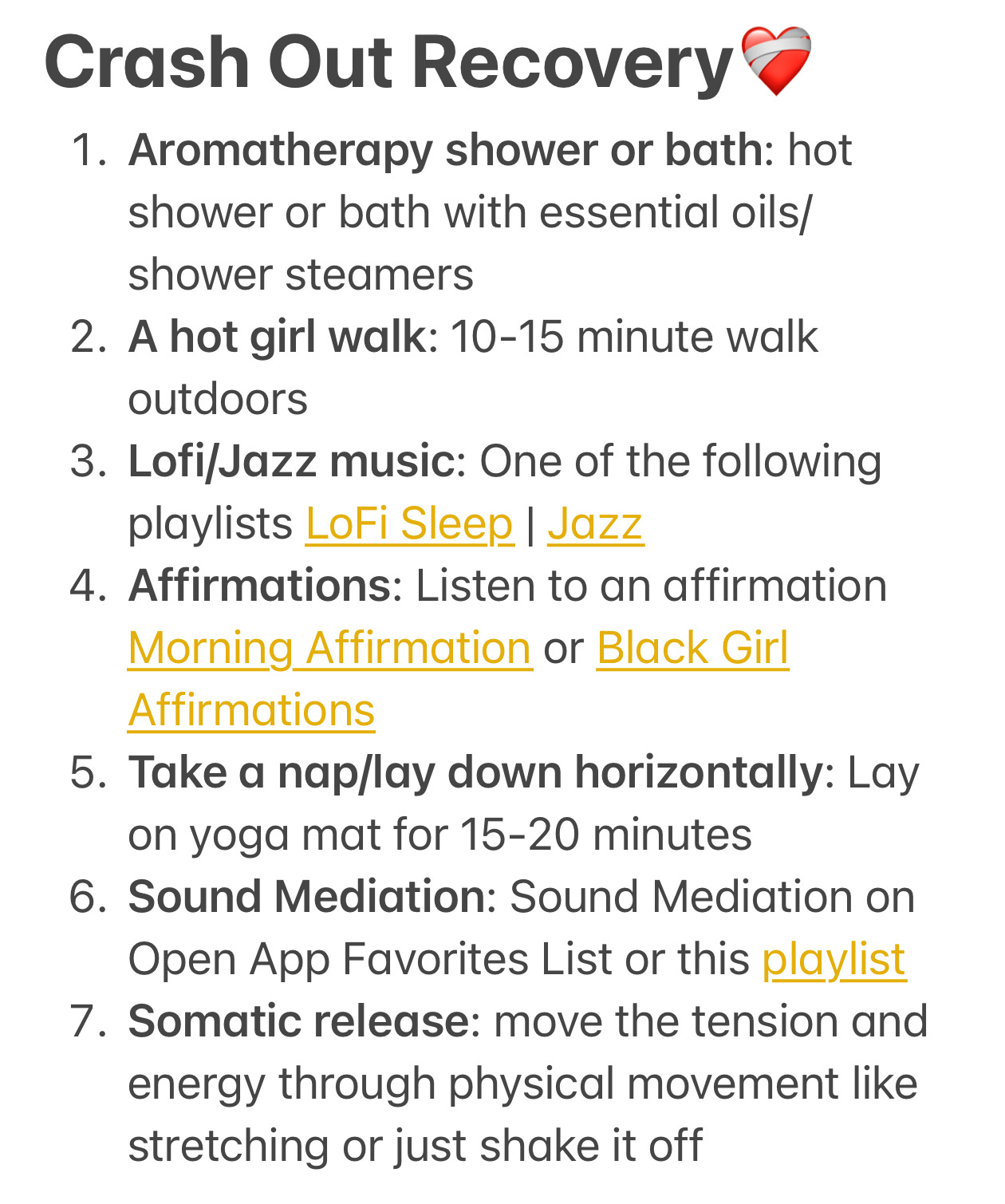 To help regulate myself, I developed a menu of practices to help me bounce back from the crash out. Depending on how deep the crash out is, how much time I have, where I am, and my energy levels I pick from this menu of items to best support myself. I’ve found having this predetermined menu/protocol takes away my decision fatigue around what to do in order to recover. It’s something that I just keep in the notes section of my phone that I have pinned at the top for quick and easy access.